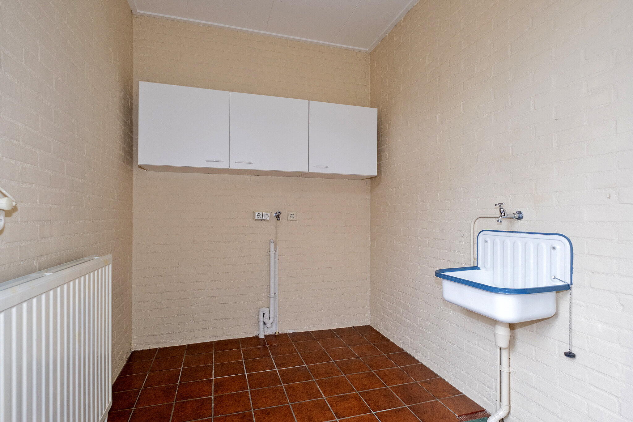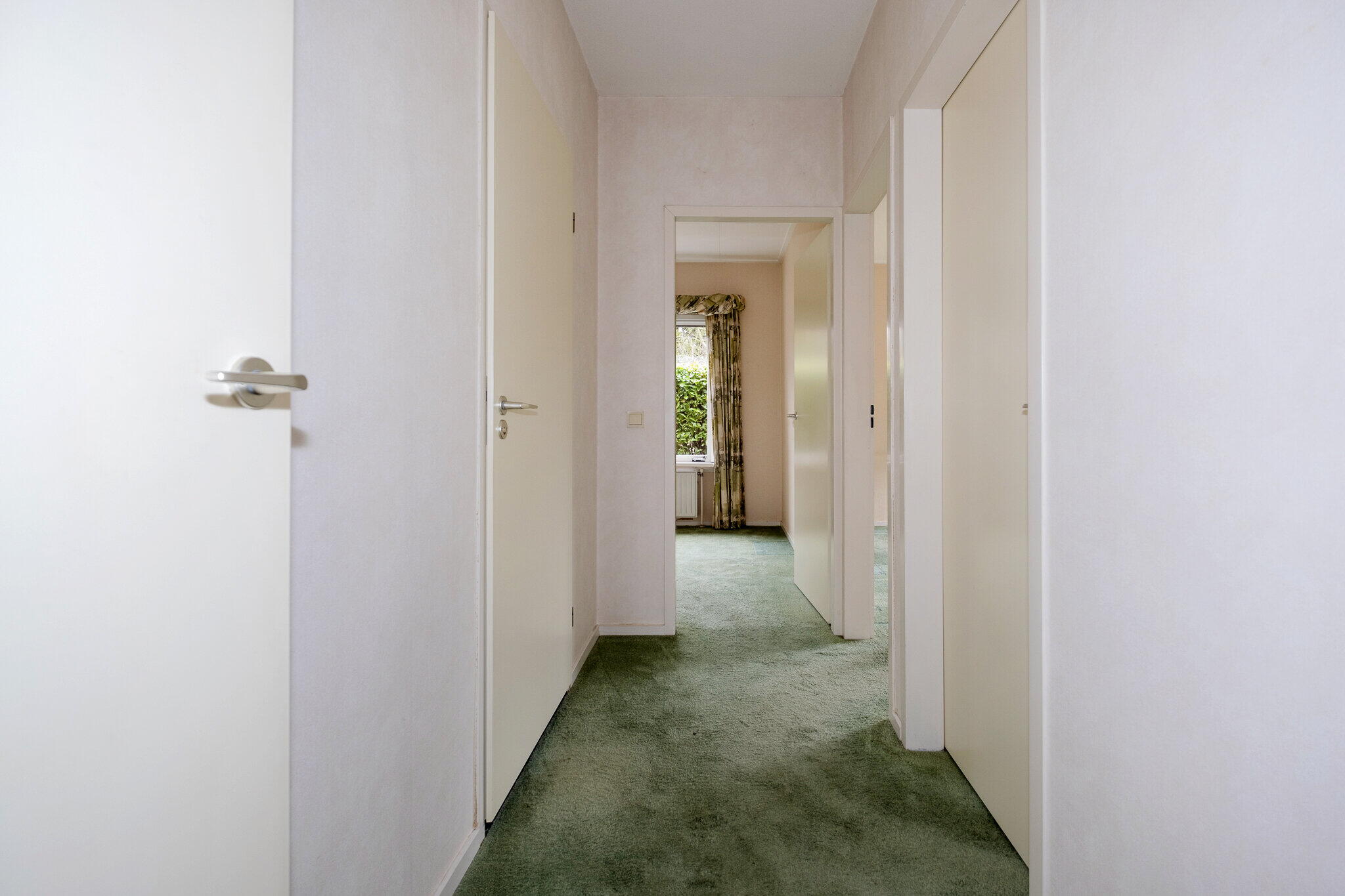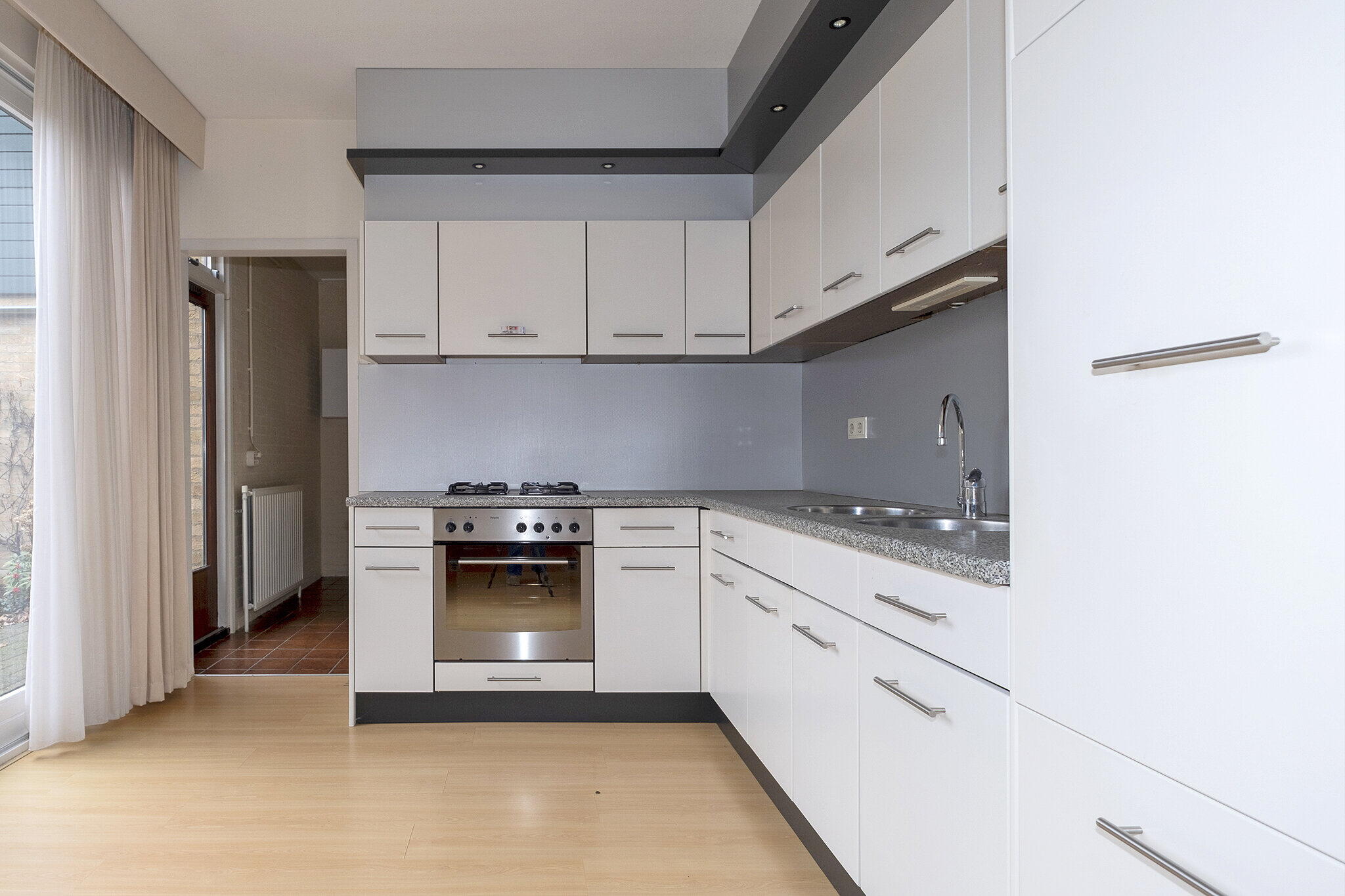 Entree in hal met stookruimte, toilet, meterkast en garderobekast. De lichte en royale woonkamer (ca. 43 m²) heeft een sfeervolle gashaard en een nette laminaat vloer. De half-open keuken (ca. 9 m²) beschikt over een 4-pits gasfornuis, afzuigkap, oven, koelkast en dubbele spoelbak. Aangrenzend bevindt zich de bijkeuken (ca. 6 m²) waar de witgoedaansluiting staat opgesteld. Vanuit de bijkeuken is er directe toegang tot de inpandige verwarmde garage en de achtertuin. Aan de andere zijde van de woonkamer biedt de achterhal toegang tot drie slaapkamers (ca. 3 m², 12 m² en 9 m²), waarvan één met kastenwand en een nette badkamer met douche en dubbel wastafelmeubel.