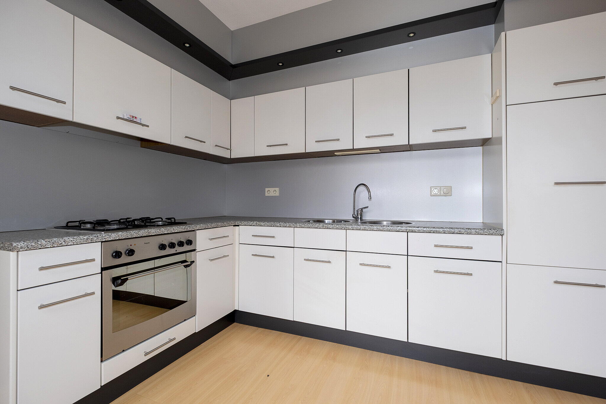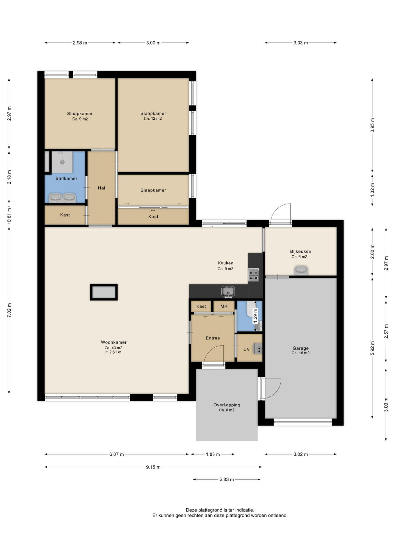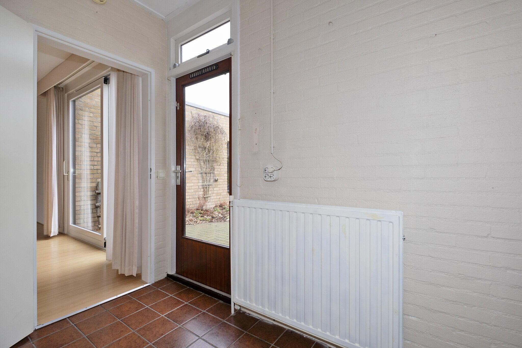 Entree in hal met stookruimte, toilet, meterkast en garderobekast. De lichte en royale woonkamer (ca. 43 m²) heeft een sfeervolle gashaard en een nette laminaat vloer. De half-open keuken (ca. 9 m²) beschikt over een 4-pits gasfornuis, afzuigkap, oven, koelkast en dubbele spoelbak. Aangrenzend bevindt zich de bijkeuken (ca. 6 m²) waar de witgoedaansluiting staat opgesteld. Vanuit de bijkeuken is er directe toegang tot de inpandige verwarmde garage en de achtertuin. Aan de andere zijde van de woonkamer biedt de achterhal toegang tot drie slaapkamers (ca. 3 m², 12 m² en 9 m²), waarvan één met kastenwand en een nette badkamer met douche en dubbel wastafelmeubel.